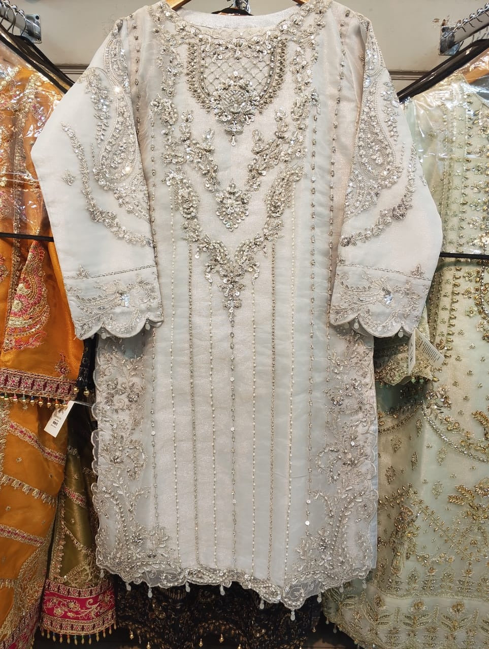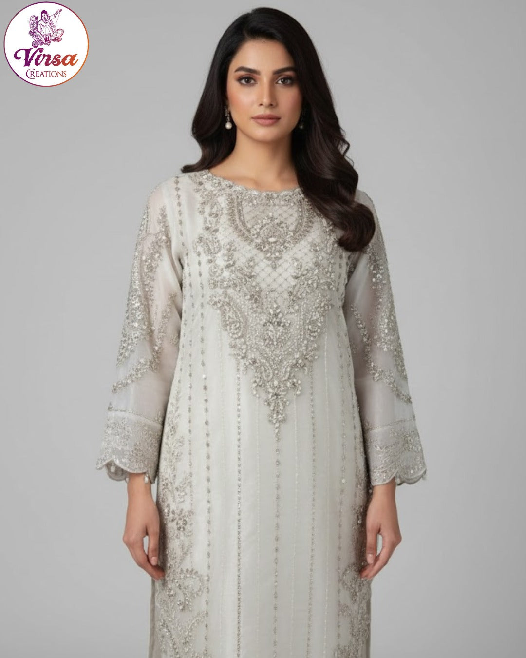 Artisanal Embroidery: Features intricate hand-embellished work, including gold zari, shimmering sequins, and delicate thread motifs that adorn the neckline, sleeves, and hemline.